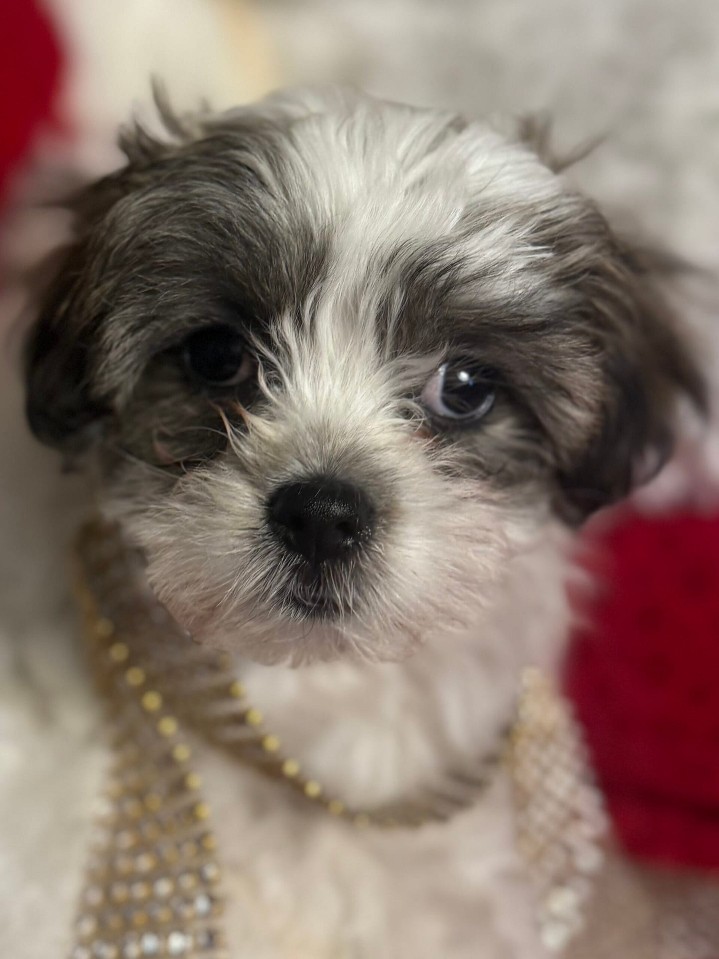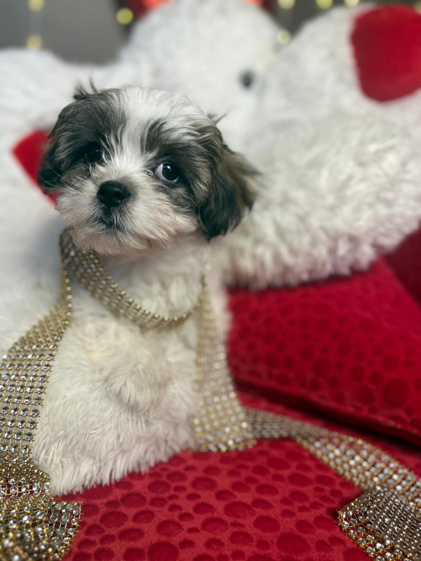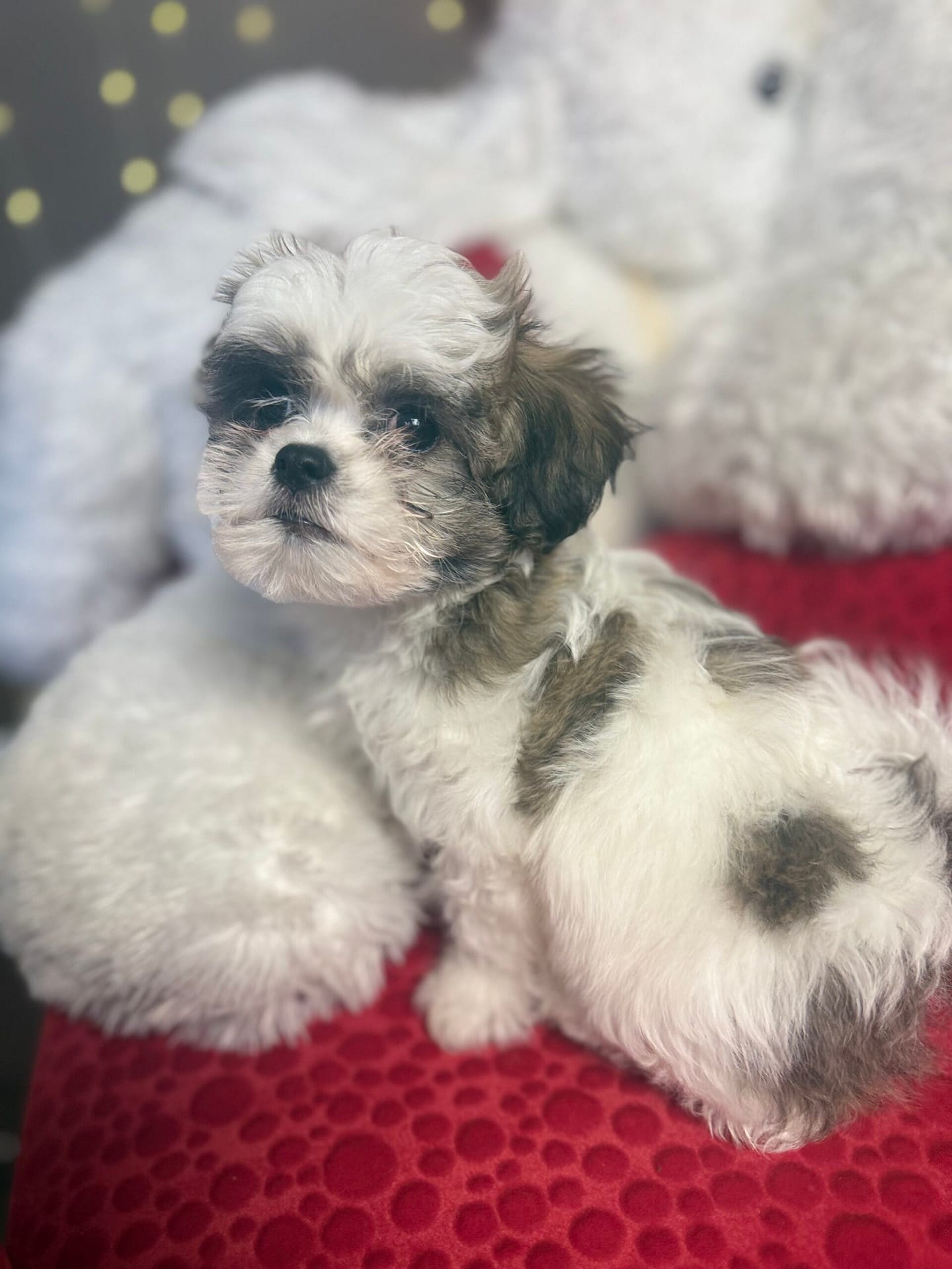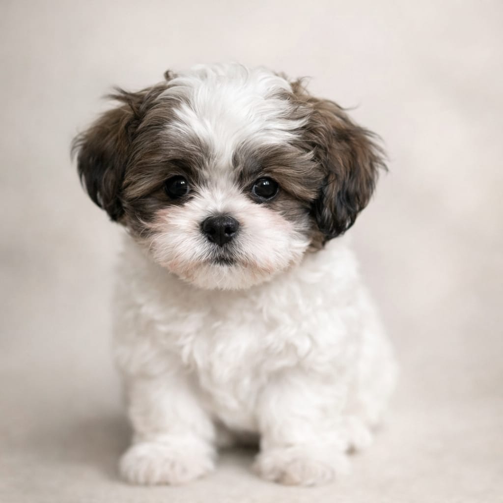Baby Baba is the firstborn of the litter and naturally confident, gentle, and steady. Weighing 3.1 lbs, he has classic Shih Tzu coloring with a mostly white coat and an adorable black mask on his face. He is calm and easygoing but becomes happily excited when people are around—especially children. Baby Baba loves attention and would thrive in a family that enjoys playful interaction and affectionate companionship.