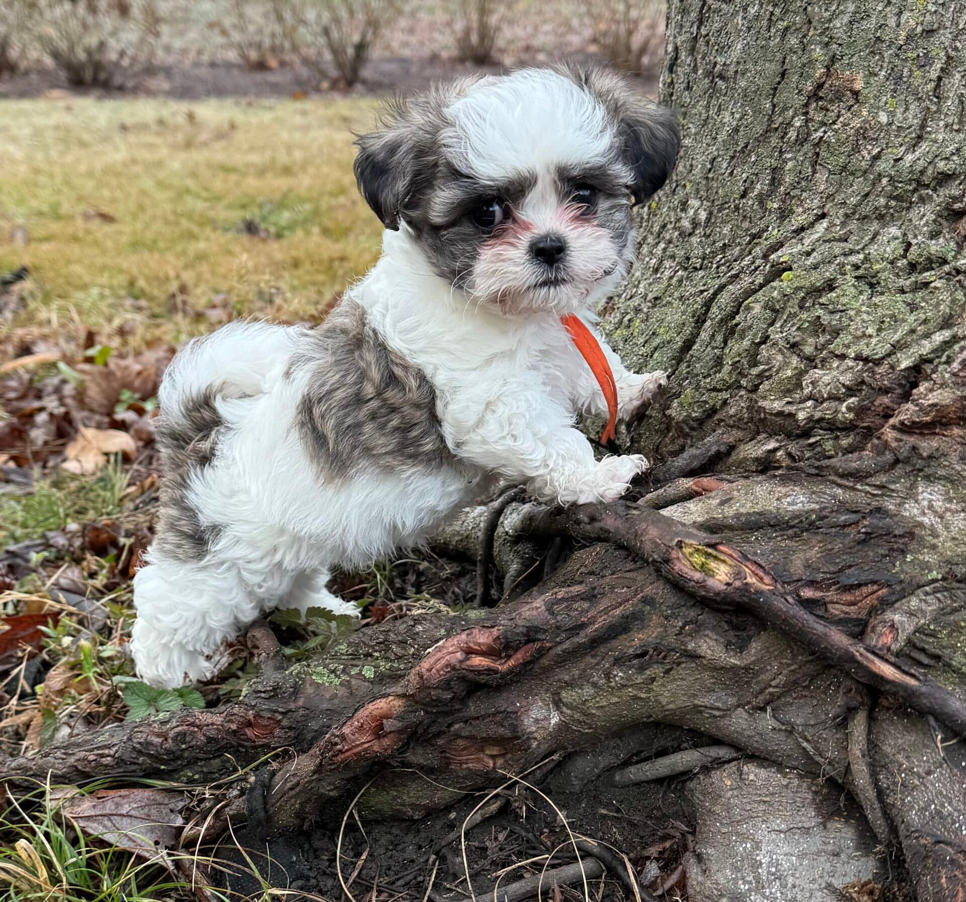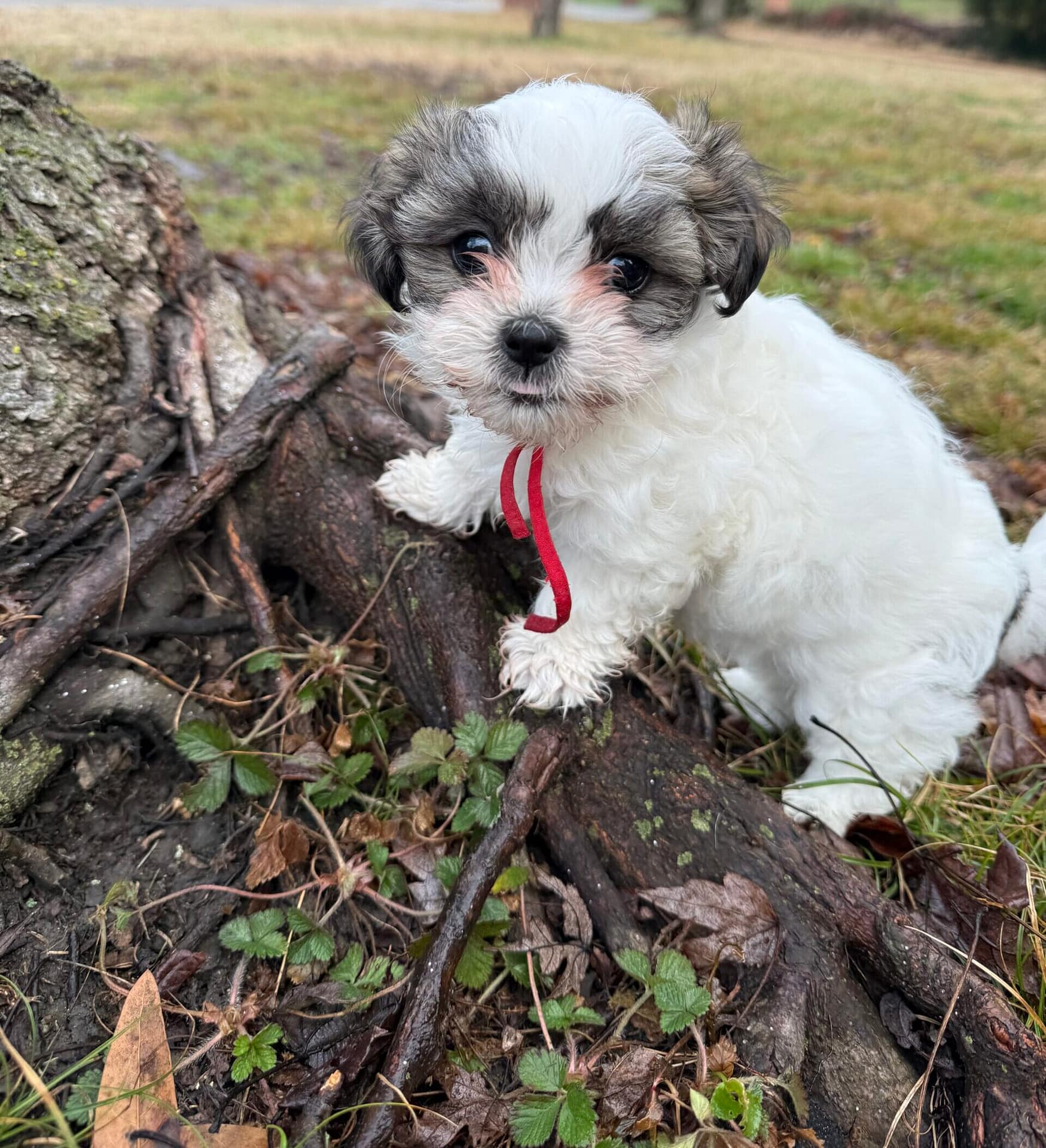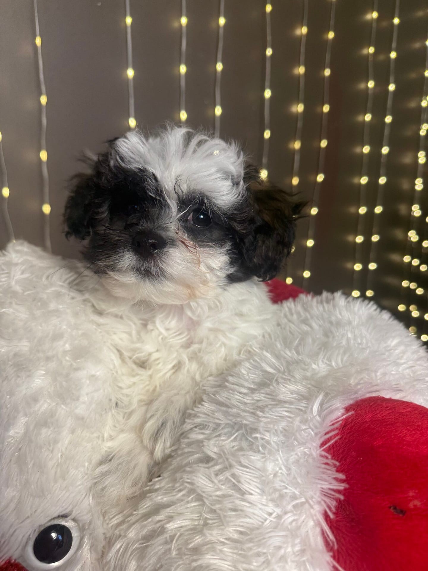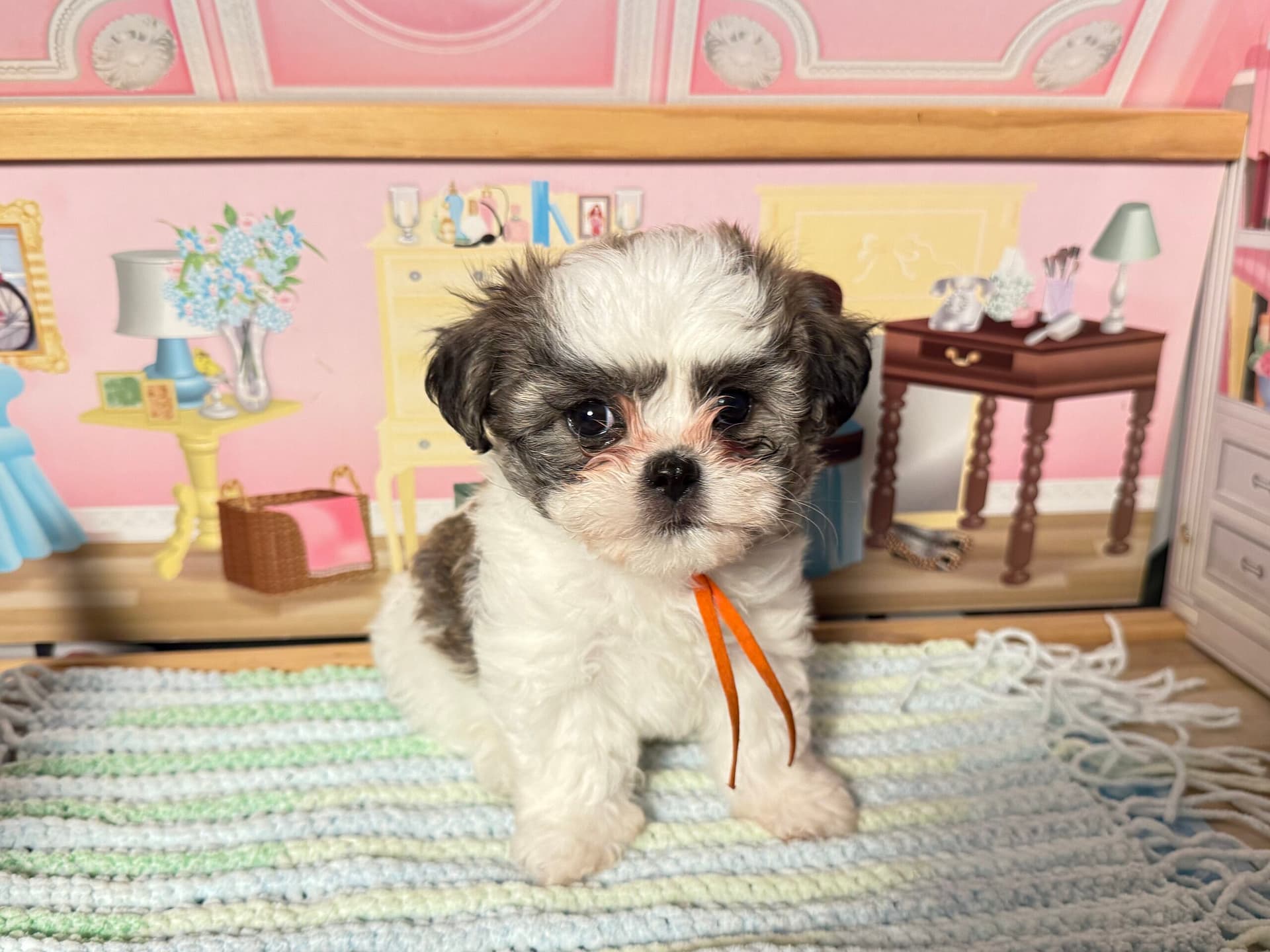 Baby Baba is the firstborn of the litter and naturally confident, gentle, and steady. Weighing 3.1 lbs, he has classic Shih Tzu coloring with a mostly white coat and an adorable black mask on his face. He is calm and easygoing but becomes happily excited when people are around—especially children. Baby Baba loves attention and would thrive in a family that enjoys playful interaction and affectionate companionship.